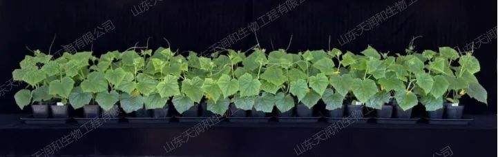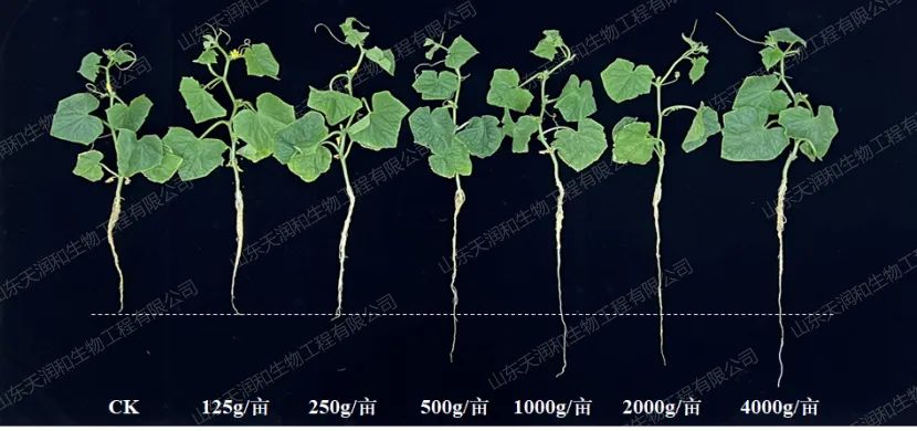 黄瓜苗冲施不同亩用量的贝莱斯菌粉后的长势对比